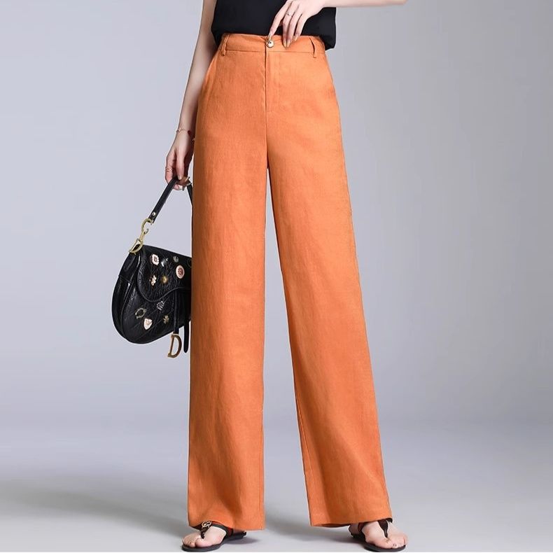 上質なリネン素材を使用したレディースノータックワイドパンツは、温かみのあるオレンジカラーが目を引くアイテムです。
