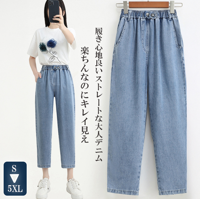 ■コメント ゆったりとしたデザインで履き心地の良いストレートデニムパンツ 足首の見えるクロップド丈で今年らしいシーズンライクな雰囲気を演出☆ 一つは持っておきたい。デイリーカジュアルにお役たちのシンプルワイドパンツ。 生地をたっぷりと使い、ゆったりとしたシルエットがPOINT♪ 気軽に使える、着回しデニムパンツ☆ ゆったり目でラクに着られてカジュアルスタイルの定番に! ■サイズ(単位:約cm) S:ズボン丈87cm ウェスト60~75cm ヒップ106cm M:ズボン丈87cm ウェスト64~80cm ヒップ110cm L:ズボン丈88cm ウェスト68~85cm ヒップ114cm XL:ズボン丈88cm ウェスト72~90cm ヒップ116cm XXL:ズボン丈89cm ウェスト76~96cm ヒップ120cm 3XL:ズボン丈89cm ウェスト80~100cm ヒップ124cm 4XL:ズボン丈90cm ウェスト84~104cm ヒップ128cm 5XL:ズボン丈90cm ウェスト88~108cm ヒップ132cm ■カラー 商品画像に記載 ■伸縮性 ややあり ■裏地 なし ■生地の厚さ 普通 ■透け感 なし ■素材 ポリエステル1% 綿99% ■包装状況 OPP袋